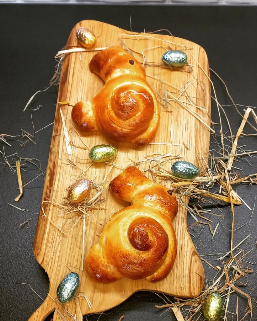 Ici en Alsace, c’est un lapin (ou liĂšvre si vous prĂ©fĂ©rez) qui ramĂšne les chocolats, pas d’histoire de cloches par ici đ! Du coup, petite recette « spĂ©ciale pĂąques » : brioches lapinous (inspiration Cookomix pour 6 lapinous) :