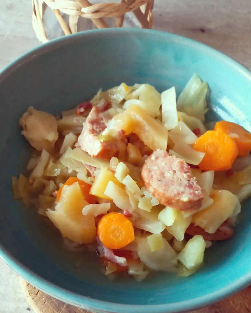 ▪️Ajouter le chou coupé en lamelles ainsi que les pommes de terre, les carottes et le navet coupés en morceaux ▪️Ajouter bouillon de légumes et 500 ml d’eau