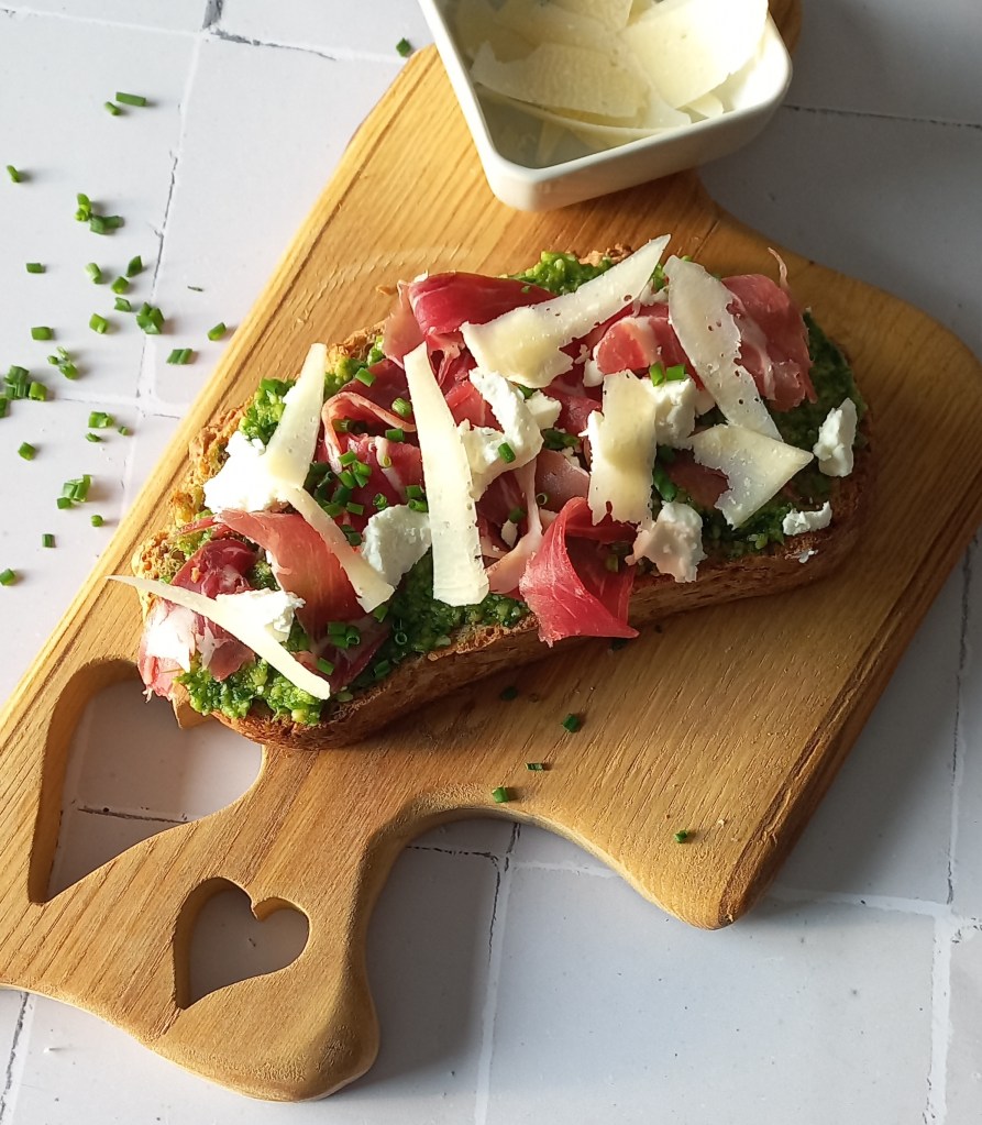 Quand je fais un pain cocotte, j’adore faire de belles tranches pour en faire des tartines salées 😋! Je vous propose une tartine au pesto : on fait légèrement griller la tranche de pain au grille-pain, on y dépose une belle couche de pesto, du jambon fumé, de la fêta, des copeaux de parmesan et de la ciboulette 🌱!