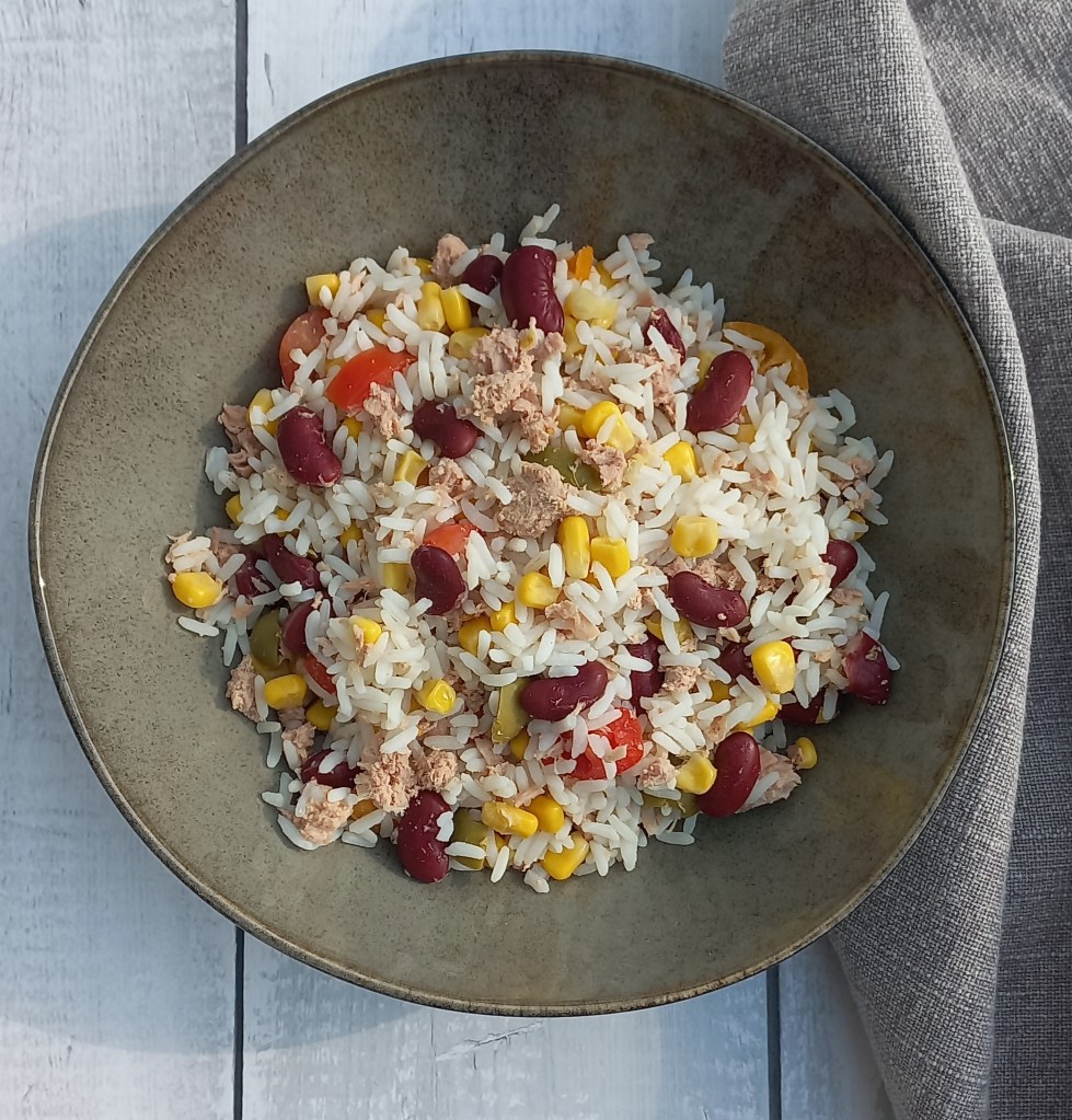 ▪️Dans un saladier, mélanger le thon émietté, le maïs, les haricots rouges, les tomates cerises et les olives