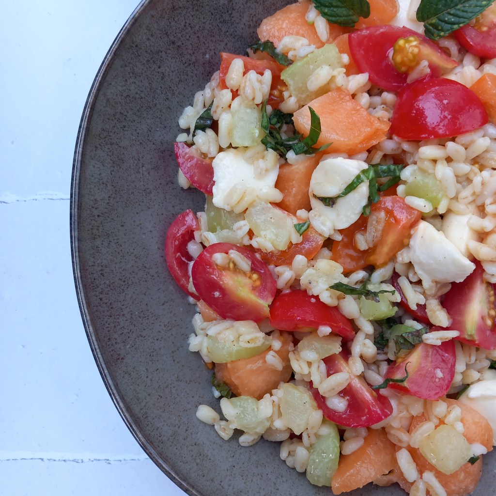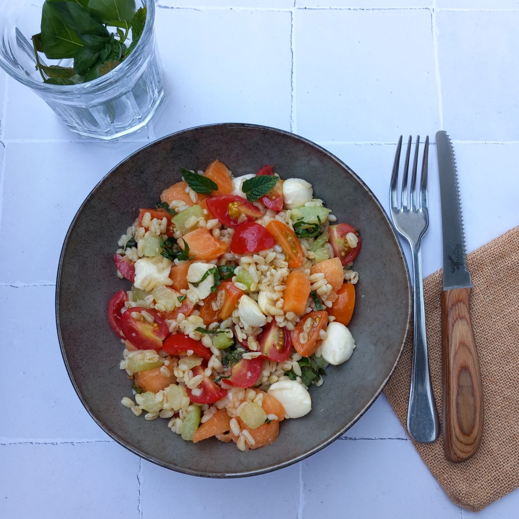 ▪️Dans un saladier mélanger le blé et les courgettes avec les tomates cerises, le melon et la menthe