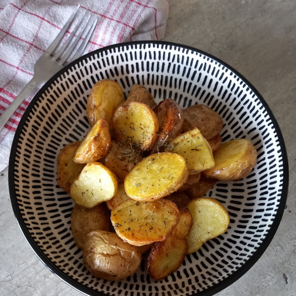 Quelques pommes de terre nouvelles non épluchées (très important 😉!), qu’il suffit de bien les laver et de les frotter avec une brosse souple. On les coupe en 2, on les dépose sur une plaque de cuisson préalablement chemisée de papier cuisson, on verse un filet d’huile d’olive, on saupoudre d’herbes de Provence et de sel, on enfourne dans le four (préalablement chauffé) à 200° pendant une demi-heure (tout en mélangeant régulièrement) et me tour est joué 🤗!