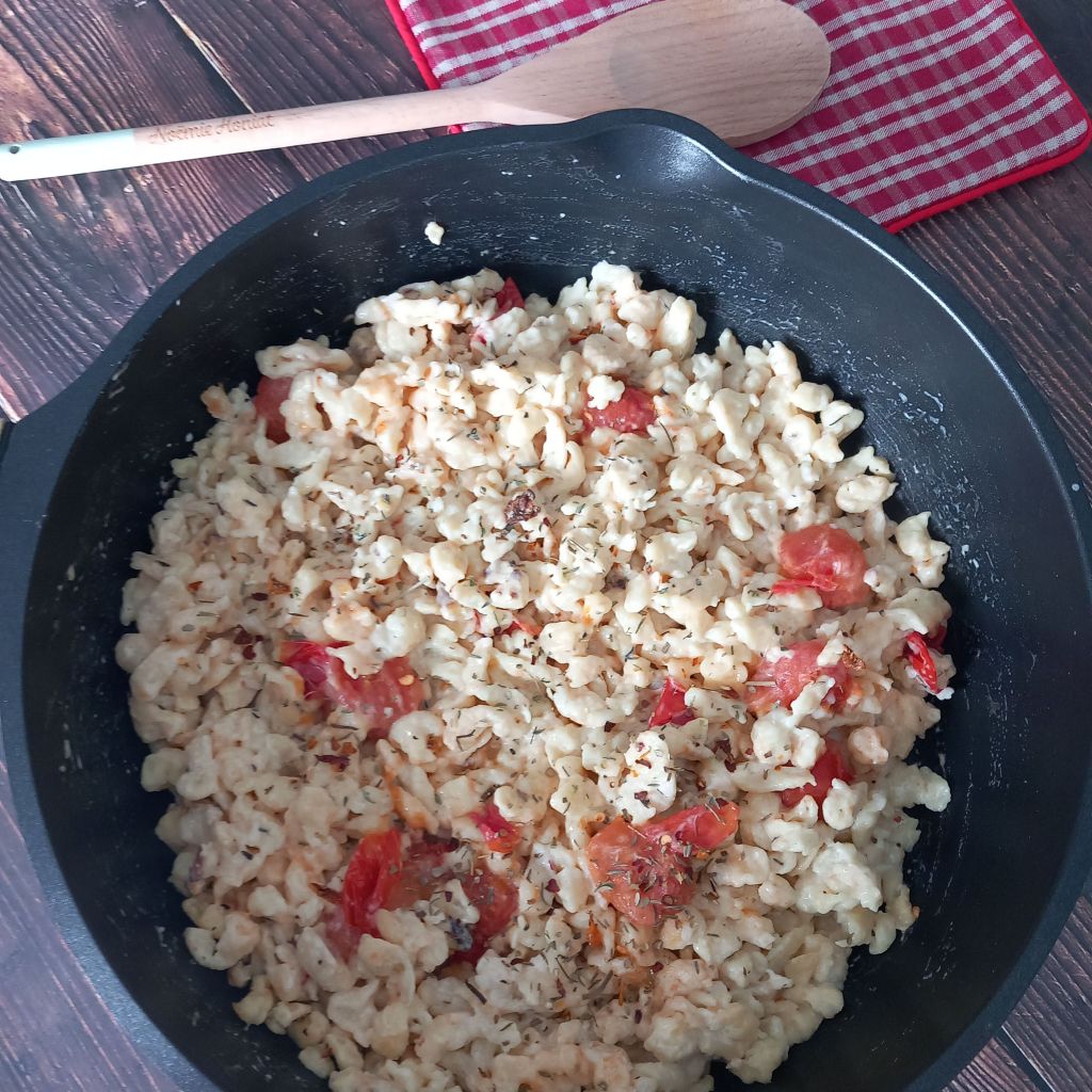 ▪️Dans une poêle plus grande, faire revenir les spaetzles avec un filet d’huile d’olive pendant une dizaine de minutes