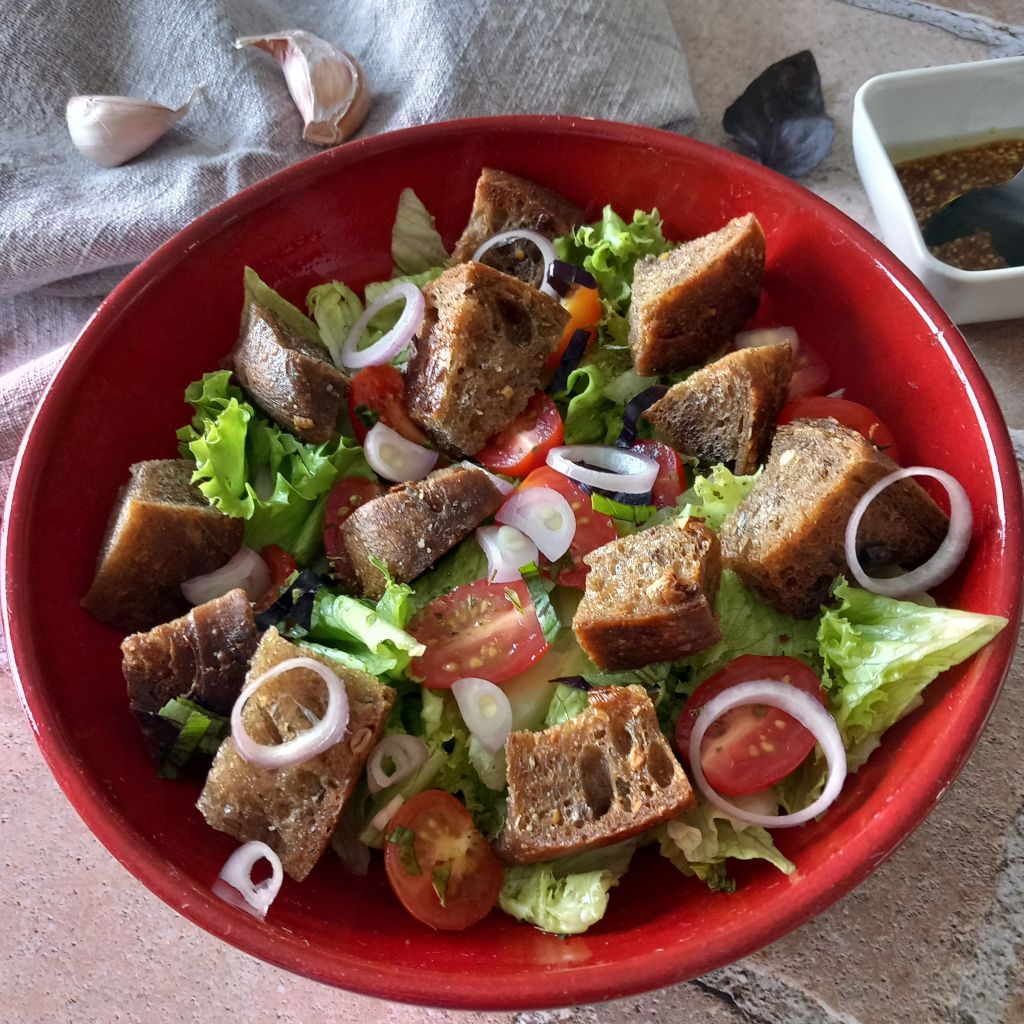 ▪️Hacher la gousse d’ail et la mélanger avec l’huile d’olive et les morceaux de pain coupés en cubes