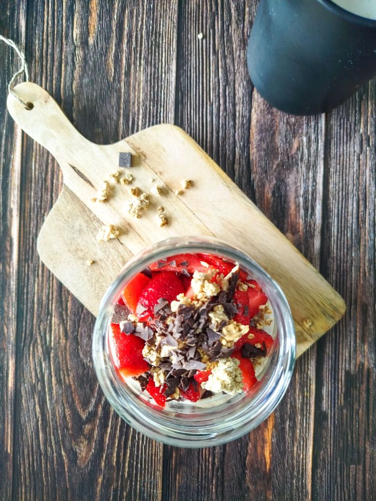 ▪️ Ajouter le topping de votre choix au moment de déguster, ici c’est fraises, granola et copeaux de chocolat noir.