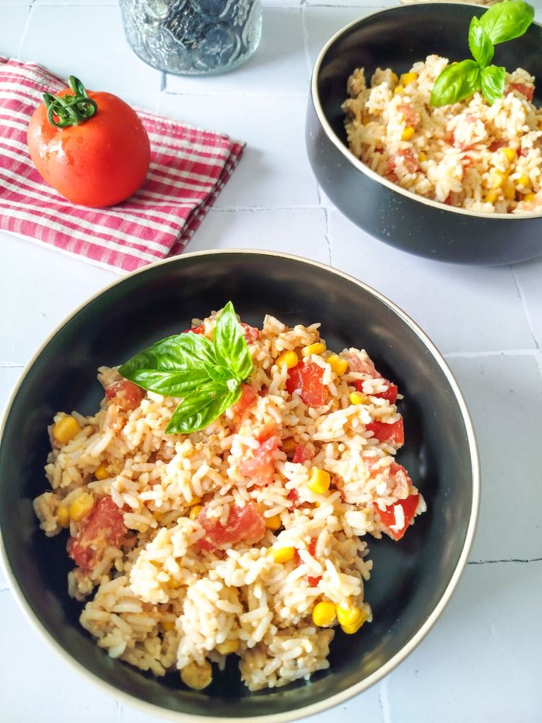 ▪️ Dans un saladier, mélanger le riz avec les œufs, les tomates, le maïs doux et les rillettes de thon émiettées