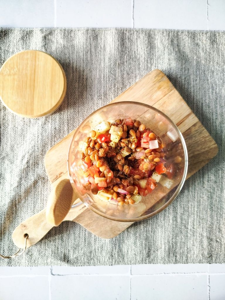 ▪️ Mélanger les lentilles avec la tomate, le concombre et l’oignon
