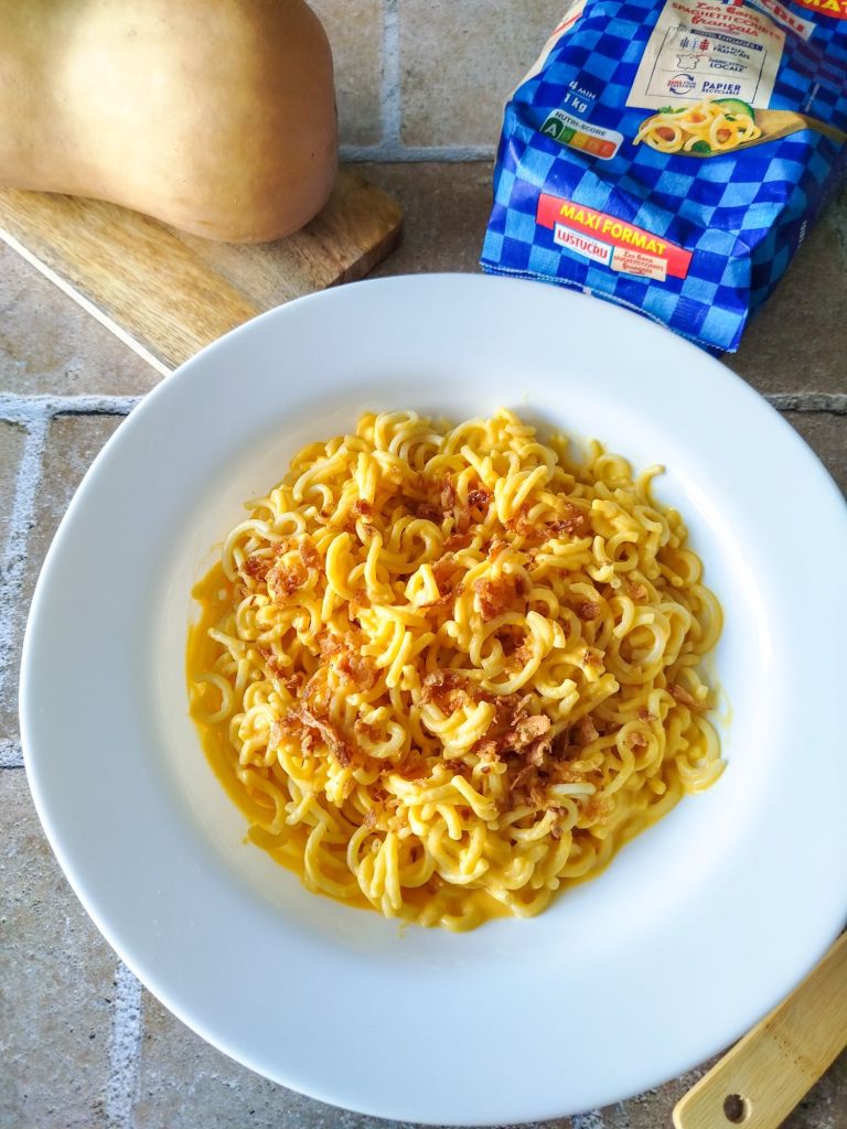 ▪️ Mélanger la crème de butternut avec les spaghettis courts